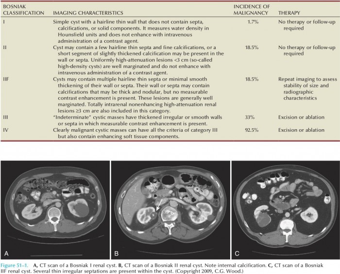 Киста почки может быть простой (I Bosniak) и сложной (II, IIF, III и IV Bosniak). Простые могут образовываться в почках на любом возрастном этапе. Отличаются наличием одной камеры, которая заполнена жидкостью. Вероятность ее преобразования в рак крайне мала. Сложные характеризуются перечисленными ранее симптомами, отличаются высоким риском озлокачествления.