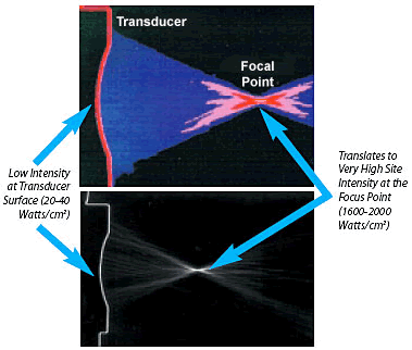 Для термоабляции ткани необходима мощность импульсов более 100 ватт на импульс. Желаемый превалирующий эффект термический, а не кавитация или механические повреждения. Термическое энерговоздействие происходит в течение менее одной секунды, хорошо управляется и регулируется в дозах. Температура немедленно повышается до 70 — 80 ° C, что приводит к термоаблации тканей. Окружающие ткани — в радиусе 2 мм от зоны фокусировки остаются неповрежденными. Зоны фокусировки небольшие (2 мм х 3 мм 30 мм), выполняемые одно за другим воздействия позволяют увеличить объём ткани, подвергшейся аблации.