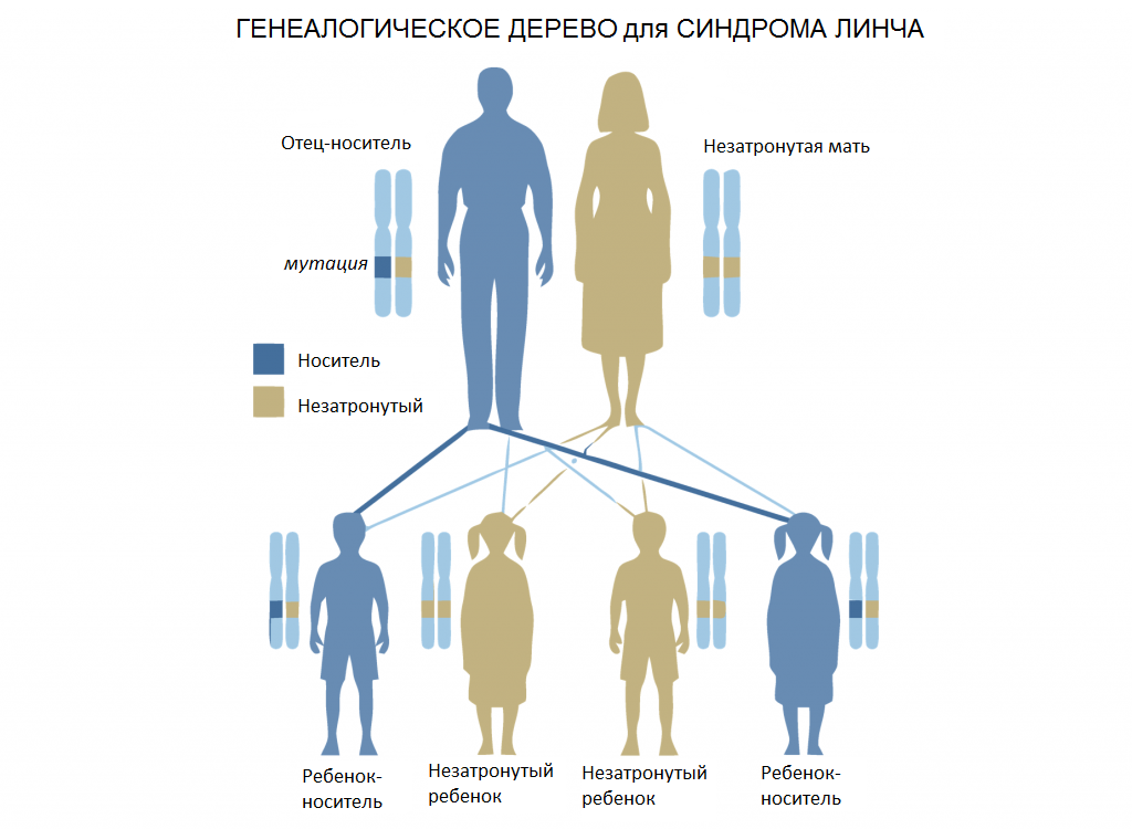 Нарушения генетического кода наблюдаются в генах MLH1, MSH2, MSH6, PMS2. Наличие синдрома Линча можно подозревать, если человеку в возрасте моложе 50 лет был поставлен диагноз рака толстой кишки, если в разных поколениях родственников имеются более два и более случаев заболевания раком толстой кишки или когда в разных поколениях семьи имеются более двух случаев заболевания эндометриальным раком, раком желудка или яичников. Таким лицам рекомендуется пройти генетическое тестирование, которое поможет выбрать правильную тактику как в отношении профилактики развития толстокишечного рака, так и периодичности диагностики.