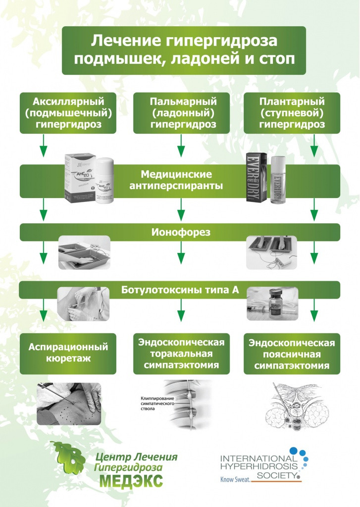 При любом виде гипергидроза, будь то аксиллярный (подмышечный) гипергидроз, пальмарный (ладонный) гипергидроз или плантарный (ступневой) гипергидроз лечение рекомендуется начинать с наименее инвазивных методов, таких как медицинские антиперспиранты.