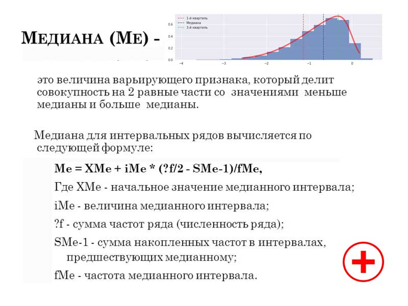 Можно также сказать, что медиана является 50-м персентилем, 0,5-квантилем или вторым квартилем выборки или распределения.