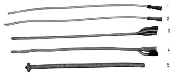 Уретральные катетеры. 1 — Нелатона (Робинсона); 2 — Тиманна; 3 — трёхходовой катетер Фолея; 4 — двухходовой катетер Фолея; 5 — Пеццера.