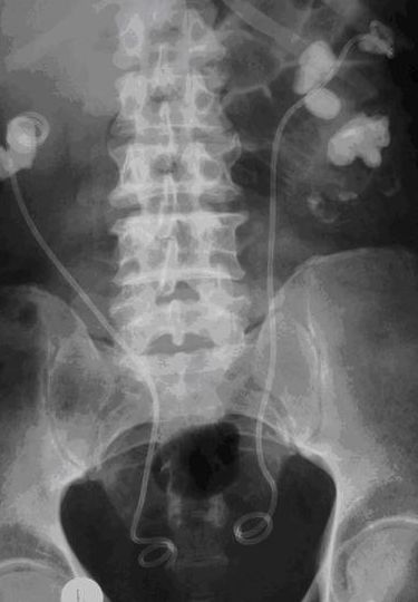 Обзорная рентгенограмма органов мочевой системы. Мочеточниковые стенты дренируют верхние мочевыводящие пути с обеих сторон при двусторонних коралловидных камнях.