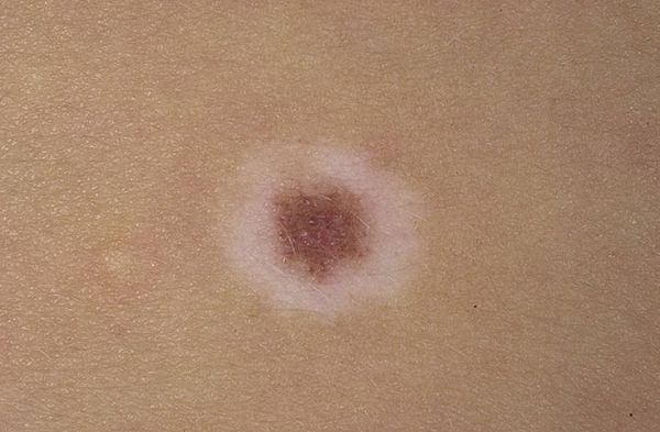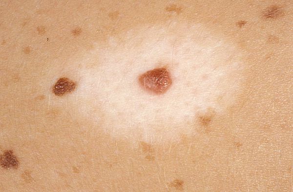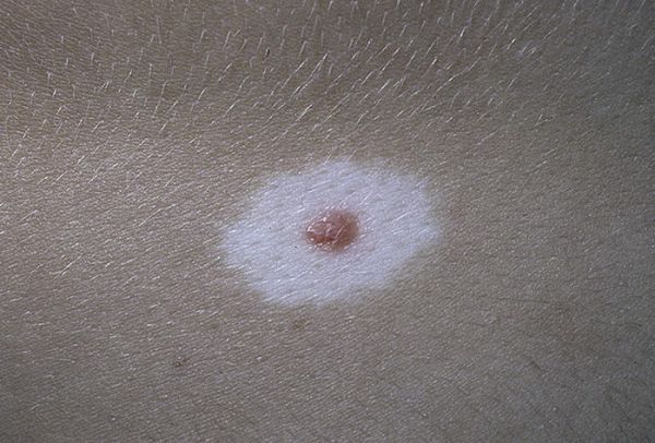 (от греческого слова «halos» — кольцо, круг). Он представляет собой образование, слегка возвышающееся над уровнем кожи, эластической консистенции, красновато-коричневого цвета, диаметром 2—5 мм, с характерной особенностью — наличием депигментированного венчика в окружности. Этот венчик в несколько раз больше пигментированного образования, располагающегося в центре. По мнению некоторых исследователей, галоневусы нередко сочетаются с иными неневоид-ными образованиями кожи, например с фиброэпителиальными невусами. Могут встречаться при раке внутренних органов.