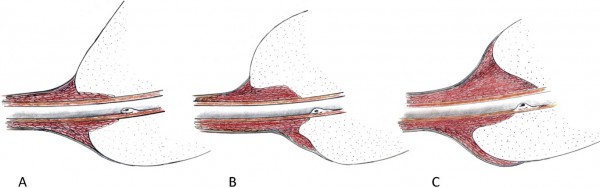 Всем пациентам выполнена позадилонная радикальная простатэктомия из поперечного надлонного доступа. В процессе вмешательства сначала выделяли верхушку простаты с последующей диссекцией дистального сегмента простатического отдела уретры, который может иметь различную конфигурацию (рис. 1).