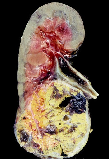 Патологическая анатомия. Макроскопически почечно-клеточный рак представляет собой опухоль сферической формы, располагающуюся в корковом веществе почки и распространяющуюся на периферические ткани. Истинная капсула отсутствует, но по периферии опухоли может быть уплотнение из фиброзной ткани и воспалительных клеток. Фасция Героты часто является барьером для инвазии в паранефральную клетчатку.