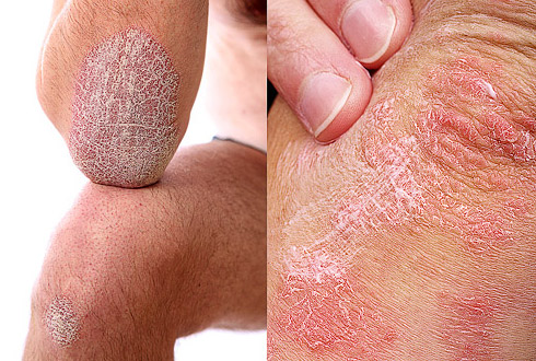 Псориаз – незаразное заболевание, причины которого неизвестны. Красные пятна с серебристыми чешуйками появляются обычно на коже головы, локтях, коленях и в области поясницы. Зачастую воспаление приводит к дальнейшему разрастанию очагов поражения. Рецидивы псориаза могут неоднократно возникать в течение всей жизни. Лечение включает в себя стероидные и ретиноидные кремы, фототерапию и лекарственные средства.