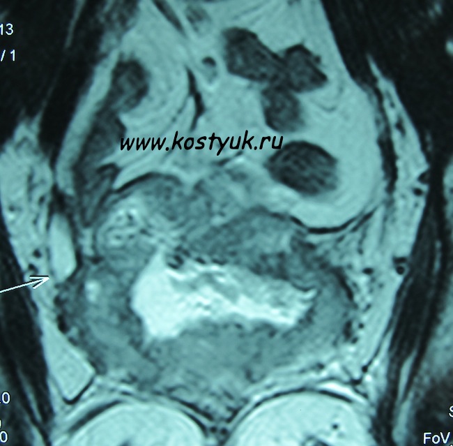 - МРТ малого таза.: из полости влагалища прослеживается свищевой ход в просвет прямой кишки в виде линейного неравномерного по толщине гиперинтенсивного МР-сигнала по Т2 ВИ, прямая кишка в ректосигмоидном отделе расширена, стенки неравномерно утолщены, слизистая сглажена. В проекции ложа матки определяется участок неоднородного изоинтенсивного МР-сигнала по Т2 ВИ, изоинтенсивного МР-сигнала по Т1 ВИ, солидной структуры, распространяющейся на прилежащие отделы прямой кишки, на область свода влагалища (преимущественно на переднюю и левую стенки), на заднюю стенку мочевого пузыря, размерами 5,4х3,2х2,7 см, после введения контрастного вещества определяется неравномерное усиление МР-сигнала от описанного участка структурных изменений. В мочевом пузыре отмечается утолщение задней стенки за счет вышеописанных изменений. Убедительных данных за увеличение лимфатических узлов не получено.