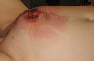Рецидив рака мочевого пузыря, распространяющийся на переднюю брюшную стенку.