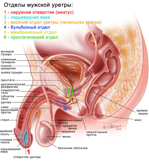 Мужская уретра (мочеиспускательный канал) распространятся от внутреннего отверстия мочеиспускательного канала в мочевом пузыре до наружного отверстия мочеиспускательного канала, открывающегося на головке полового члена. Мочеиспускательный канал (уретра) представляет собой двойную кривую при обычном расслабленном состоянии полового члена. Длина мочеиспускательного канала варьирует от 17.5 до 20 см, и делится на три части: простатическая, мембранозная и пенильная части уретры, структура и отношение которых существенно различаются. За исключением состояния, когда происходит мочеиспускание и семяизвержение, большая часть мочеиспускательного канала находится в спавшемся состоянии, а щель образуется в поперечном и продольном положении с ее соприкасающимися верхней и нижней поверхностями, наружное отверстие мочеиспускательного канала представляет собой вертикальную щель, мембранозная часть мочеиспускательного канала представляет собой нерегулярную или звездчатую форму, а простатическая же часть уретры несколько выпуклая.