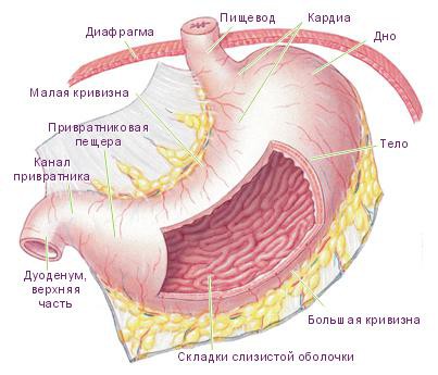 В соответствии с анатомической классификацией желудок состоит из кардиальной части, дна, тела и пилорической части. Последняя подразделяется на привратниковую пещеру (антрум) и пилорический канал. Общепринято различать переднюю и заднюю стенки желудка, которые переходят друг в друга. Верхний, более короткий и вогнутый край желудка, называется малой кривизной, а нижний, выпуклый и более длинный — большой кривизной. На малой кривизне имеется угловая вырезка, которая является границей между телом и пилорической частью желудка.