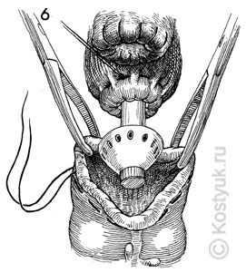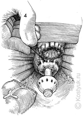 4 - Вид со стороны таза показывает влагалищную манжету, покрытую синтетическим кетгутовым швом. Цепной шов помещен в ректальную культю и связан вокруг центрального стержня степлера EEA. Наковальня сшивателя продвинута, и нисходящая ободочная кишка мобилизована сверху. В этот момент нисходящая ободочная кишка содержит два ряда хирургических скоб, которые предотвращают утечку содержимого в рану.
