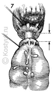 9 - В этом сагиттальном разрезе, показывающем аппроксимированную прямую и толстую кишки, сшиватель EEA загружается двойным рядом скрепок, которые проходят через перевернутые края кишечника. В то же время круглый скальпель внутри сшивателя отсекает избыток тканей подвернутой кишки.
