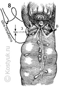 8 - Когда механическое приближение двух концов кишечника достаточно завершено, четыре синтетических поглощаемых шва Лемберта располагаются на север, восток (В), на юг (Ю) и на запад (З), чтобы снять напряжение на линии шва и дать дополнительную поддержку анастомозу.
