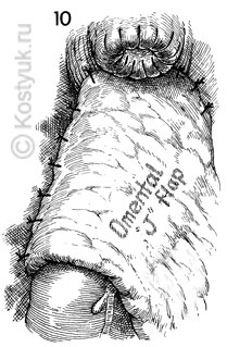 10 - Если имеется достаточно тканей сальника, создается J-образный лоскут, который вводится в таз, чтобы покрыть анастомоз.
