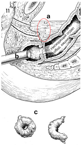 11 - В этом сагиттальном разрезе таза после завершения анастомоза степлера ЕАОС тазовая полость заполнена стерильным солевым раствором (а), а стерильный сигмоидоскоп продвигается через анус до уровня анастомоза (b). Виден весь анастомоз. Если замечены точки кровотечений, они коагулируются. Если имеются дефекты, они отмечаются. Небольшой объем воздуха закачивается в прямую кишку. Сшитый анастомоз должен быть герметичным. Если есть дефект, пузырьки будут подниматься к поверхности солевого раствора, благодаря чему хирург наблюдает место дефыекта. Сшиватель EEA демонтируется, и два куска кишки, прямой и толстой (c) удаляются из устройства сшивания. Во всех случаях они должны быть полными кругами. Если они не являются полными кругами, указывается дефект анастомоза, а анастомоз следует снимать и восстанавливать, или дефект должен быть надлежащим образом закрыт швом.