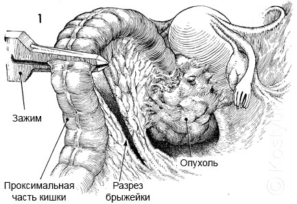 1 - Пациент находится в положении лежа на спине. Разрез живота делается через левый парамедиан или срединный разрез. Сигмовидная кишка идентифицируется, мобилизуется и поднимается. Место для перересечения кишки выбирается с учетом локализации патологического очага. Брыжейка открывается приблизительно на 8 см. Обычно верхняя геморроидальная ветвь нижней брыжеечной артерии должна быть лигирован и пересечена. Нижняя брыжеечная артерия также лигируется и пересекается у основания.