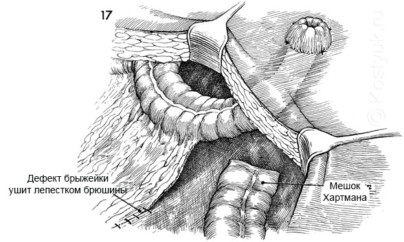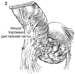 2 - С помощью степлера GIA проксимальный конец дистального сегмента толстой кишки (мешок Хартмана) надежно ушивается. Дальнейшая операция по этому сегменту, как правило, не требуется. Редко целесообразно перитонизировать сформированную культю.