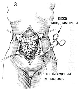 3 - Соответствующее место для колостомы отмечается на передней брюшной стенке пациента несмываемыми чернилами до начала операции. Зажим Аллиса помещается на кожу на этом участке и место стомы приподнимается.