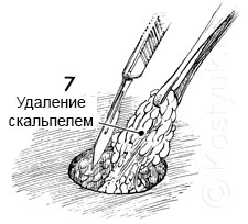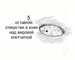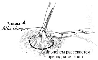 4 - В то время как кожа удерживается на зажиме, скальпелем по окружности рассекается кожа и подкожной клетчатка соответствующего диаметра.