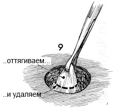 9 - Фасция поднимается при помощи зажима Аллиса. Скальпелем удаляется диск фасции диаметром 4 см.