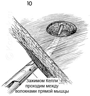 10 - Большой зажим Келли вводится через брюшину, между волокнами прямой мышцы живота. Отверстие расширяется примерно до 4 см с помощью зажима Келли и пальцев, пока в отверстие не будут свободно проходить два пальца.