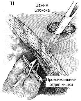 11 - Зажим Бэбкока вставляется через отверстие в брюшной стенке и захватывает дистальный сегмент нисходящей ободочной кишки.