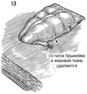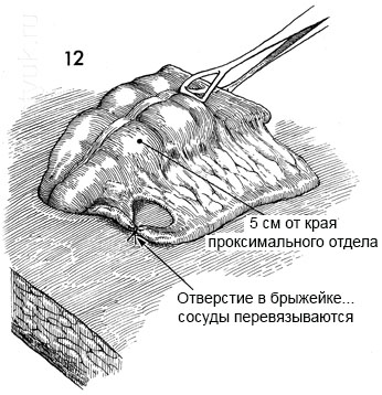 13 - Избыток жировой ткани удаляется. Кровоснабжение толстой кишки таково, что до 5 см толстой кишки она пистается от точки перевязки сосудов в брыжейке. Толстая кишка большей длины может некротизироваться.