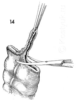 14 - Прошитый конец проксимальной толстой кишки поднят с помощью щипцов и отсекается изогнутыми ножницами Майо.