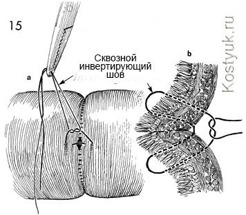 15 - Когда все, кроме 5-мм отверстия в стенке кишки, ушито, может применяться прилегающий крайний шов. Литера "a" на рисунке показывает ближайший крайний шов. Когда он привязан, он резко инвертирует всю линию шва. Литера "b" - поперечное сечение ближнего крайнего перевернутого шва, в котором излагаются детали техники. Обратите внимание, что ближний крайний перевязочный шов - единственный стежок в технике Gambee, который привязан к серозной ткани кишечника, а не к слизистой оболочке. Шов начинается помещением через серозу из одного сегмента кишки примерно на 1 см от края. Он проникает во всю поверхность и выходит из слизистой оболочки примерно на 1 см от края. Шов сразу же обращается вспять и проходит через слизистую оболочку того же сегмента кишки на расстоянии 3 мм от края, пронизывает всю стенку того же сегмента и выходит из серозы. Это ближайший и дальний виток этой строчки. Затем шов помещают через ближний край противоположного сегмента кишечника в 3 мм от края через его серозу, чтобы проникнуть через всю стенку кишечника и выйти из слизистой оболочки. Игла немедленно помещается обратно через слизистую оболочку примерно на 1 см от ее края, пронизывает всю стенку кишки и выходит из серозы примерно на 1 см от ее края. Связывание шва резко инвертирует весь анастомоз.