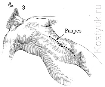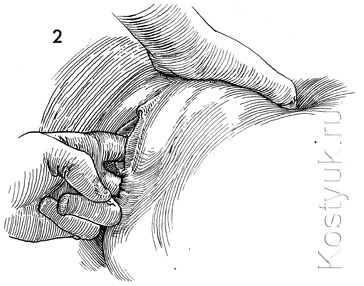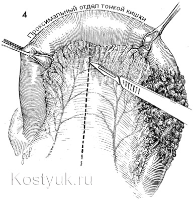 4 - Тонкая кишка, подлежащая резекции, мобилизуется, а брыжейка тщательно исследуется для вычленения сосудистых аркад. Точка перерезки выбирается достаточно далеко от пораженной части и в непосредственной близости от здоровой сосудистой аркады. Толщу кишки следует фиксировать между зажимами Бэбкока или тёплой марлей, смоченной в физрастворе, удерживаемой между большим пальцем и первым пальцем. Брюшину на брыжейке вскрывают скальпелем, используя технику, позволяющую не пересечь подстилающие кровеносные сосуды.