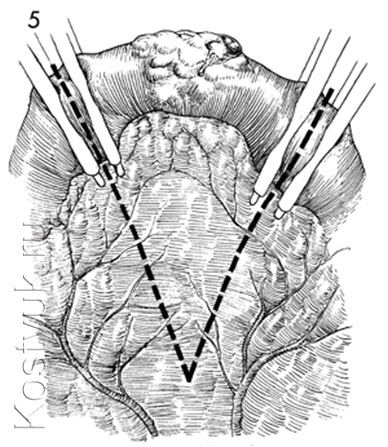 5 - Стволовые зажимы накладываются проксимально и дистально от зоны удаления. Брыжейка рассечена V-образно. Мелкие сосуды, пересекающие линию перерезки, зажаты и привязаны.nbsp;