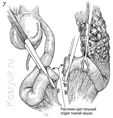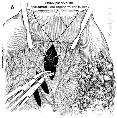 Патологический сегмент тонкой кишки удаляется, а оставшаяся тонкая кишка повторно подтягивается до здорового сегмента кишечника.