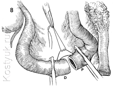8 - Пораженную часть кишеки удаляют в сторону, а здоровый сегмент проксимальной подвздошной кишки (Р) доводится до анастомоза здорового сегмента дистальной подвздошной кишки (D). Первым шагом в этом анастомозе является размещение шва Лемберта 3-0 Dexon через брыжеечную границу примерно в 1 см от края слизистой оболочки. Цель этого стежка - снять напряжение с будущей линии шва и удерживать кишечник в подходящем приближении для остальной части анастомоза.