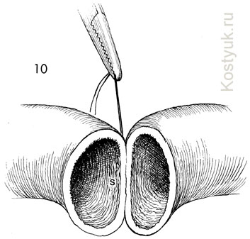 10 - Первым шагом в технике Gambee является наложение шва, ранее отмеченного на рисунке 8, на брыжеечную границу кишечника. Это называется здесь южным (S) швом.