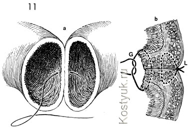 11 - Техника Gambee представляет собой однослойный сквозной анастомоз; все узлы которого завязаны внутри просвета кишечника. b - поперечное сечение a. Обратите внимание, что начальный шов Lembert (L), расположенный на брыжеечной границе кишечника, был связан и, следовательно, имеет тенденцию выворачивать края слизистой оболочки. Шов Gambee (G) был помещен через слизистую оболочку; вся стенка кишки выходит из серозы, входит в серозную оболочку кишечника на противоположной стороне, проходит стенку кишечника и выходит из слизистой оболочки. Когда он привязан, он далее инвертирует край кишечника.