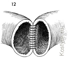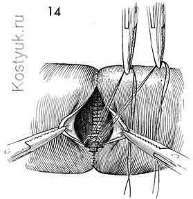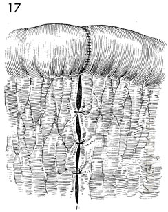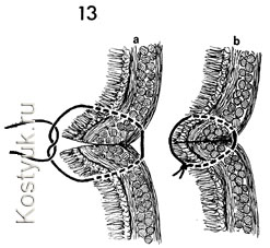 13 - Сечение шва Гамби показывает путь шва. В "а" шов входит в кишечник через слизистую оболочку, проходит через всю стенку кишечника, выходит из серозы, проходит через серозу противоположного сегмента кишечника, проникает сквозь всю стенку кишечника и выходит из слизистой оболочки, а "b" шов Gambee связан с узлом на стороне просвета кишки, стремясь инвертировать анастомоз.