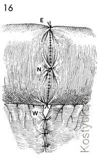 16 - Четыре разгрузочных шва Лемберта 3-0 Dexon расположены на север (N), восток (E) и запад (W) от оси кишечника. Эти швы далее инвертируют анастомоз и снимают напряжение с линии шва, чтобы улучшить заживление.